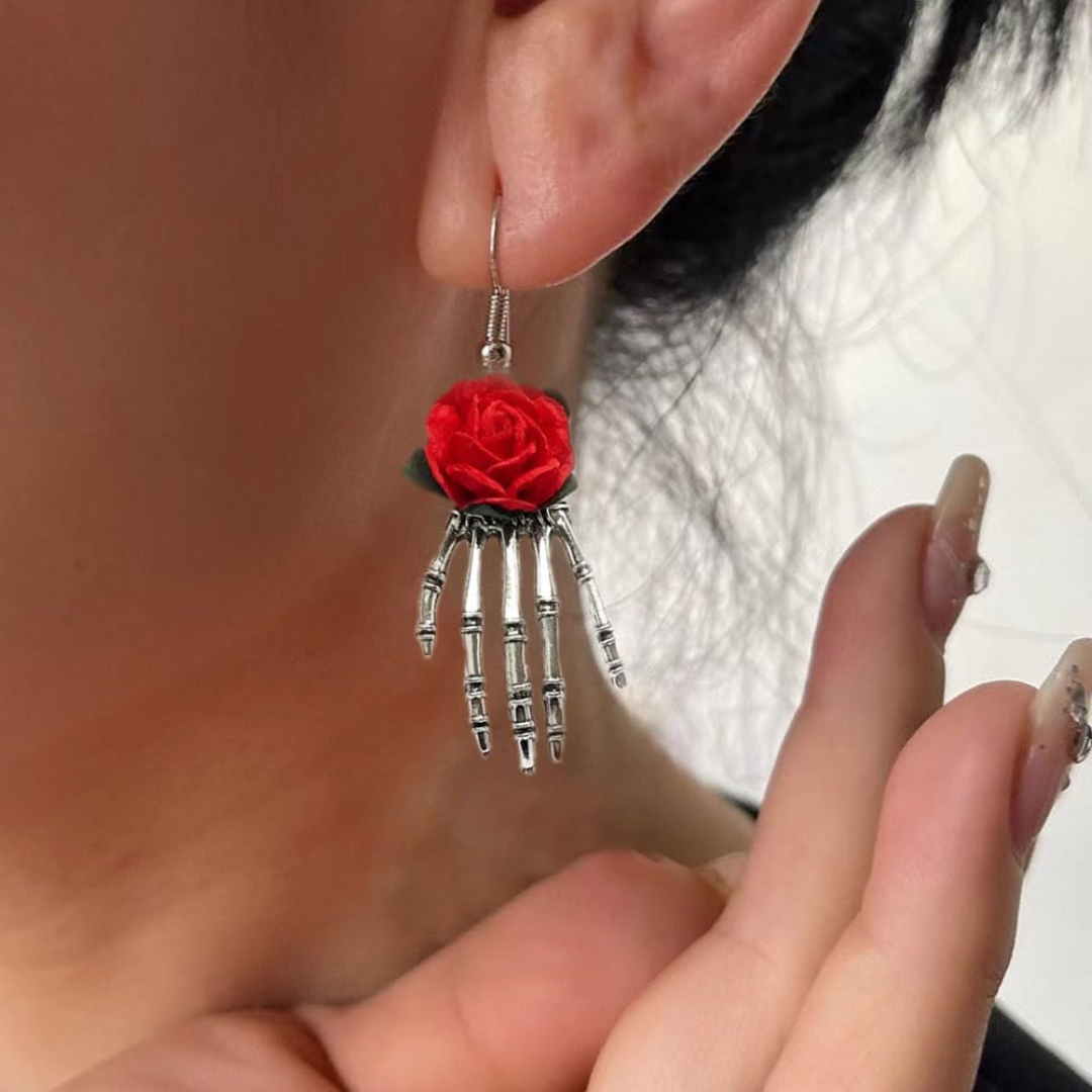 Gothic Red Rose & Silver Plated Skull Hand Earrings – Unique Everyday Jewelry for Men and Women