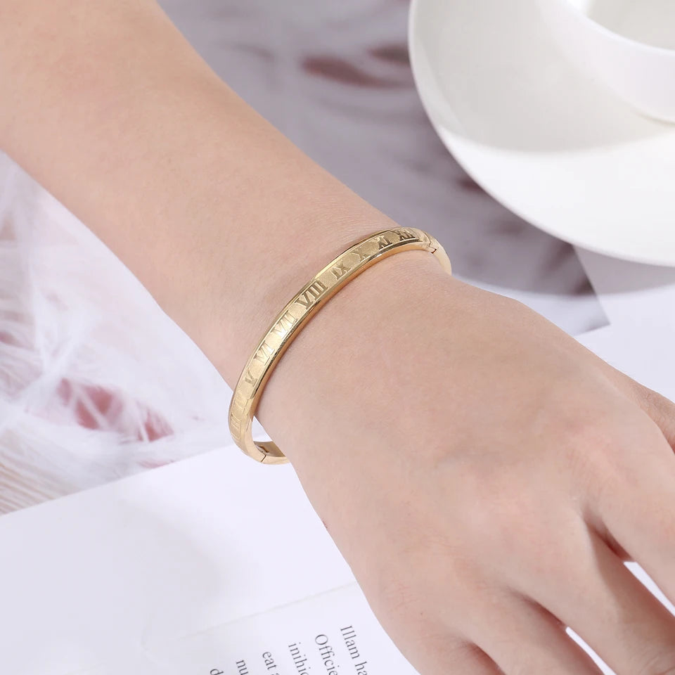 18K Gold Color Stainless Steel Roman Numerals Bracelet – 4mm & 6mm Wide Lover Cuff Bangle for Women, Perfect for Gifts